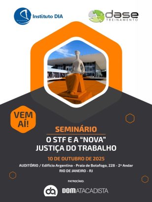 Rio de Janeiro receberá, no dia 10 de outubro de 2025, a partir das 13h30, no Edifício Argentina, o Seminário “STF e a nova Justiça do Trabalho”, uma iniciativa da Dase Treinamentos em parceria com o Instituto Dia (Duc in Altum). O encontro, de caráter restrito, reunirá um público seleto de magistrados, advogados, empresários, contadores, procuradores e profissionais de recursos humanos para discutir os impactos das recentes decisões do Supremo Tribunal Federal sobre o Direito e a Justiça do Trabalho no Brasil.